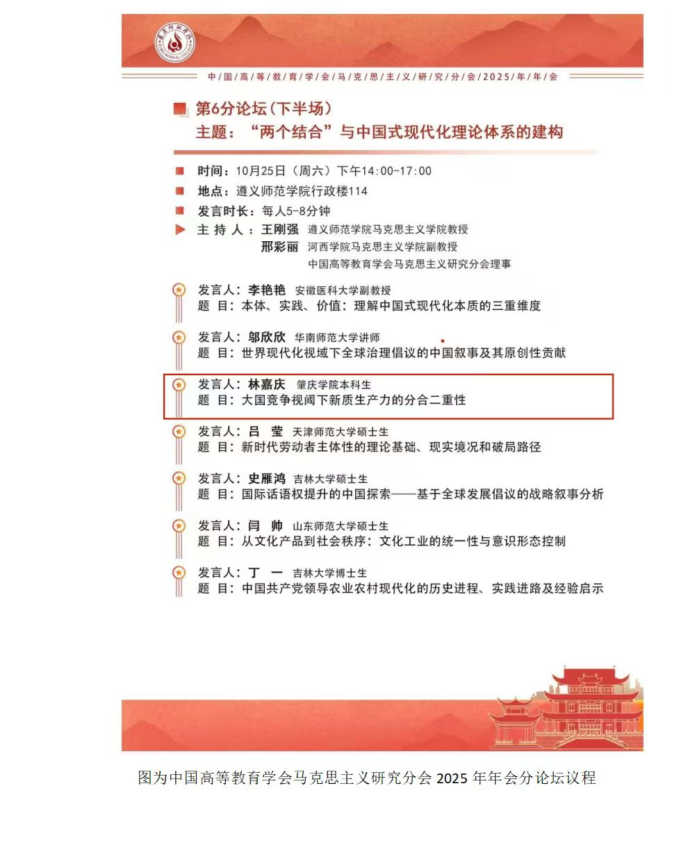本网讯 2025年10月25日,中国高等教育学会马克思主义研究分会2025年年会在贵州遵义召开。本届年会主题为“马克思主义与社会主义文化强国建设”,由中国高等教育学会马克思主义研究分会、中国李大钊研究会、遵义师范学院联合主办,遵义师范学院马克思主义学院承办,《当代中国马克思主义研究》《毛泽东邓小平理论研究》《李大钊研究》编辑部协办。来自北京大学、清华大学、中国人民大学、南开大学、中国社会科学院、中共中央党校(国家行政学院)、遵义师范学院等单位共计200余人参加会议。我院2023级思政1班学生林嘉庆受邀参会并做汇报。