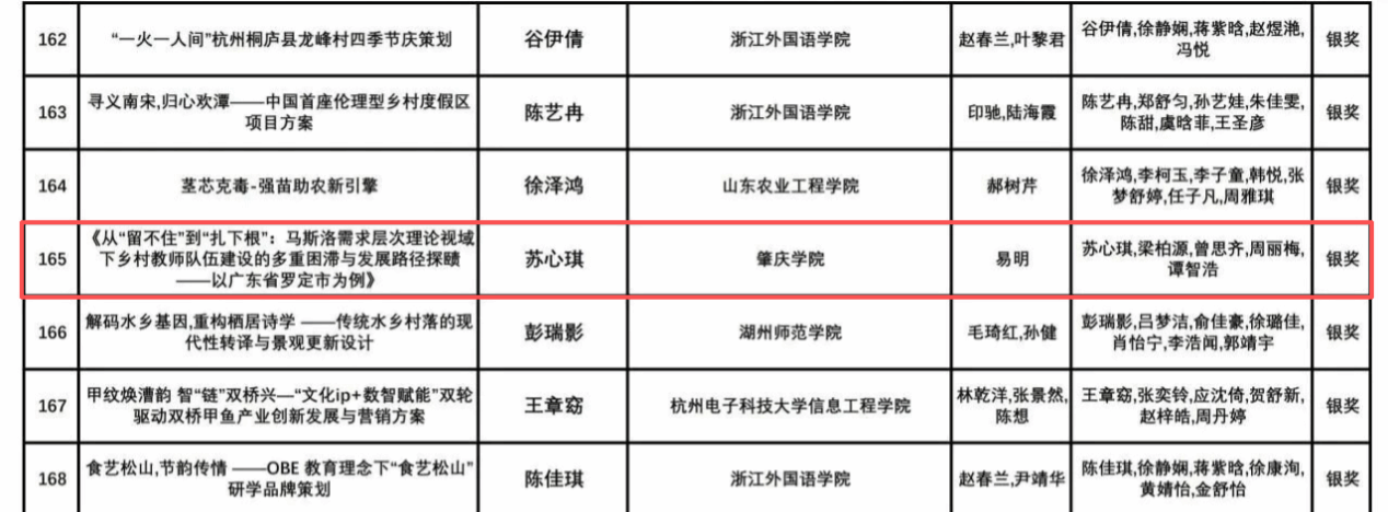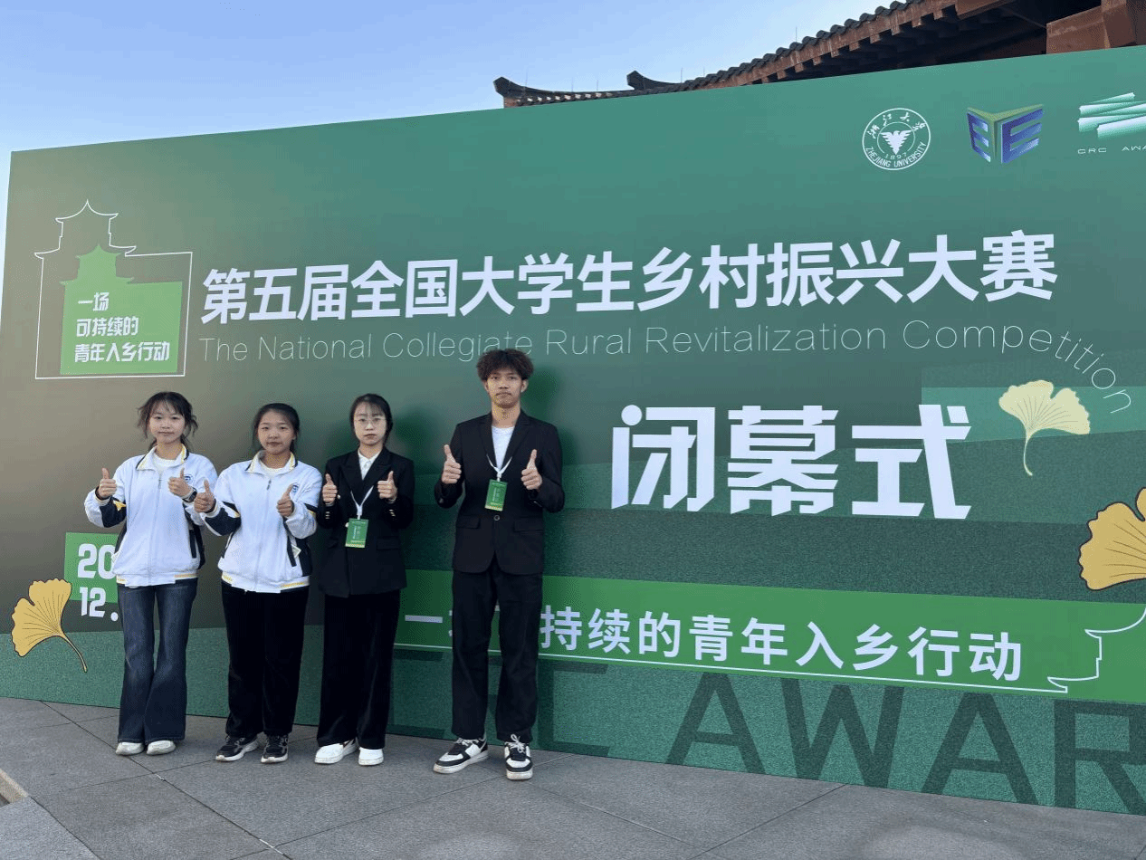 2025年12月14日,第五届全国大学生乡村振兴大赛在浙江大学隆重举办。本次大赛由中国青年创业就业基金会、浙江大学新农村发展研究院主办,共青团浙江大学委员会协办,吸引了北京大学、浙江大学、南开大学等全国多所高校同台竞技,围绕乡村产业、乡村建设等多个领域展开激烈比拼。我院参赛团队凭借扎实的专业理论功底,以马斯洛需求层次理论为切入点,文理结合剖析乡村教师队伍建设的现实困境与发展路径,充分展现出新文科视角下服务乡村振兴的实践价值与青年担当,最终在大赛中斩获国家级银奖。