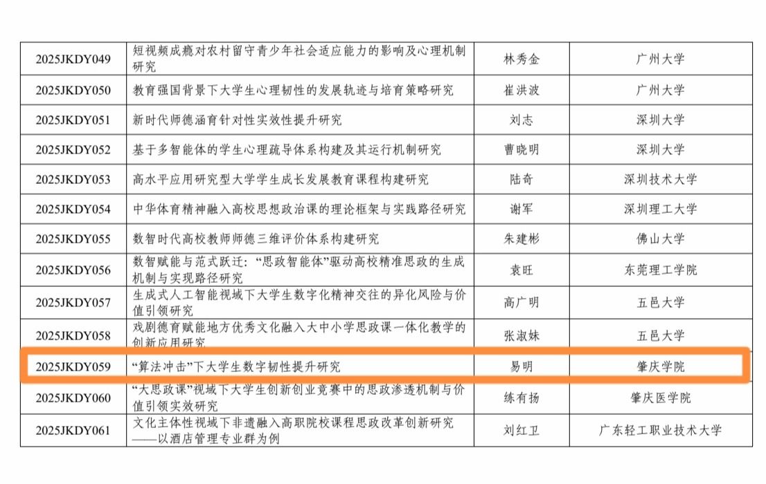 本网讯 近日,省级科研项目立项结果正式公布。我院易明老师获得广东省教育科学规划专题立项,唐艳秋老师获得第四批广东省高校名辅导员工作室立项,张海鹰老师获得广东省思政教育课题立项。在此,向三位成功立项的教师表示热烈祝贺!