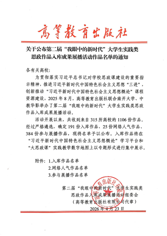 本网讯 近日,由高等教育出版社联合南开大学、中教华影共同举办的第二届“我眼中的新时代”大学生实践类思政作品入库成果展播活动评选结果正式公布。我院师生作品《盘海波:从岳山造林到教育强国的坚守者——以绿意滋养心灵,用教育筑梦未来》(指导老师:朱晶,团队成员:郑彤、李曼妮、林嘉庆)成功入库。